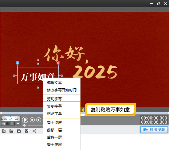 紧接着,在时间轴的0秒位置,选中刚刚输入的“你好,2025”这行字幕,使用复制粘贴功能复制出相同的字幕行,然后双击复制后的字幕,将其内容修改成下一句祝福语,比如“恭喜发财”。修改完成后,根据整体画面的布局和视觉效果,按需对字幕的大小、颜色以及透明度进行微调,同时,灵活地调整特效时长,通过不同的时长设置,打造出速度各异的动态效果。依此类推,将其他祝福语如法炮制,复制粘贴后修改内容、样式,让祝福如雪花般纷纷扬扬铺满屏幕。