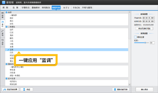 而在第三步,我们需要点击“画面风格”左栏的“美化”,为视频应用“蓝调”效果。蓝色调的加入,能为夏日主题的视频增添清凉感,与糖果色调的甜美相结合,营造出清爽又甜蜜的夏日氛围,让观众仿佛置身于充满果香的夏日乐园。